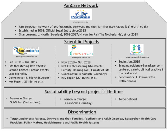 The PanCare network, which was established in 2008, is a multidisciplinary pan-European network of professionals, survivors, and their families that aims to reduce the frequency, severity, and impact of late side-effects of the treatment of children and adolescents with cancer [21]. The PanCareLIFE consortium originated from this network and addresses late effects that potentially reduce the quality of life of survivors, namely hearing and fertility impairments, as well as health-related quality of life. PanCareLIFE started in November 2013 and ended in October 2018. Summarized information on the objectives and aims of the project are provided by the Community Research and Development Information Service (CORDIS) of the European Commission [22].