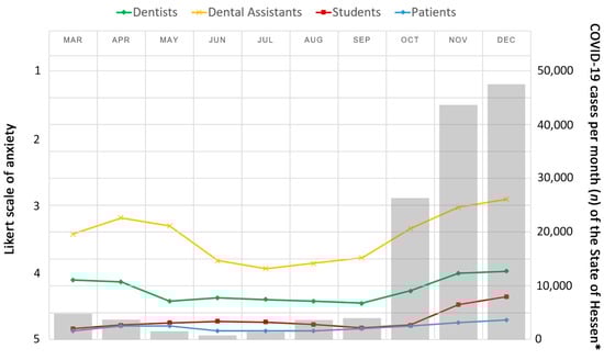 Figure 2 displays the anxiety of dentists, dental assistants, students, and patients to become infected with COVID-19 at the dental clinic in relation to the COVID-19 cases per month in the state of Hessen from March to December 2020. An impressive increase in anxiety was clearly demonstrated between October and December. Mainly dental assistants were affected, and the difference to students was significant (p < 0.05). A tendency of increased anxiety could be detected in the months of October, November, and December, always with the highest rate for dental assistants, and corresponding to the pandemic situation in the state of Hessen/Germany.