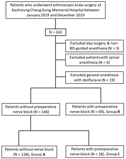 A total of 243 anesthesia records of patients who underwent arthroscopic knee surgery were retrieved from the hospital’s database. We included 215 patients after exclusions. We deliberately excluded patients under desflurane anesthesia because the number of cases was too small. Patients were segregated into Groups A (n = 128), B (n = 69), and C (n = 18), as shown in Figure 1. Table 1 summarizes the demographic characteristics of the patients.