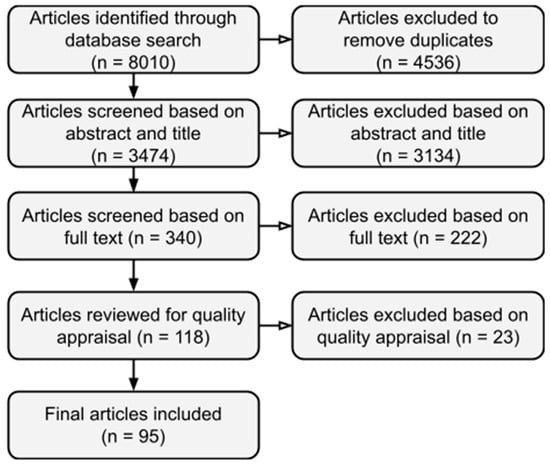 This systematic review included available, English language, full-text, peer-reviewed primary research using quantitative (experimental and epidemiological) methods which were conducted in high-income countries and published between 1978 and 2019. High-income countries were defined by the World Bank as countries with a Gross National Income (GNI) per capita of USD 12,056 and above for the year 2017 []. The review included studies with a focus on adult sex workers (over 18 years) and excluded child prostitution and trafficking. The legal age of adulthood and consent to sell sex varies globally within and between countries and cultures []. While application of a universal demarcation (e.g., 18 years) has been critiqued for its ethnocentrism [], for comparative and pragmatic purposes and to reduce the likelihood of children being included as part of study populations, the authors defined adulthood as per the United Nations Convention on the Rights of the Child []. Articles in which sex workers had been trafficked, or the consent to sex work was ambiguous, were excluded. Articles from 1978 onwards were included in the literature search given in part the lasting impacts upon sex industry legislation resulting from the emergence of the HIV epidemic in the late 1970′s [,]. Due to the complex nature of sex work, many articles were noted that involved vulnerable population groups such as people who use drugs, people experiencing homelessness, incarcerated individuals, transgender people, people experiencing mental health disorders and individuals who had experienced physical or sexual abuse. Such articles were excluded if the primary focus was not sex work, or if sex work was utilised as an outcome measure rather than as a population descriptor. This approach was chosen to ensure that clarity of the research population was maintained.