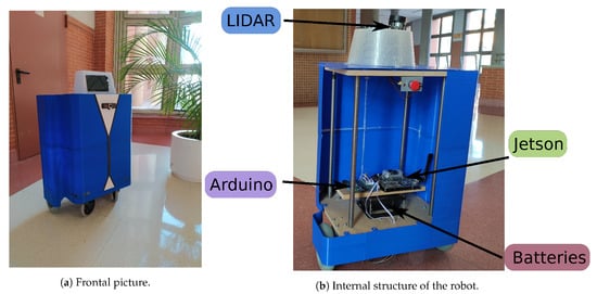 It is a differential wheeled robot, equipped with two motors and their corresponding encoders, which are all controlled with an open-source Arduino board. All mechanical and electrical design has been performed by us. The internal structure is constructed of wood and metal. Additionally, the outer shell, imitating a person wearing a tuxedo, was made entirely by 3D printing. The platform is powered by two batteries, and it includes an electronic driver interface to allow easy interconnection of the different parts of the system and all the power management. All the electrical system can be powered with 24 or 12 Volts. For our implementation, we have opted to use 12 Volts to reduce the maximum speed that the motors can provide. Powered wheels are 190 mm in diameter and 590 mm is the axis distance. The complete platform measures approximately 800 mm, slightly higher than a table.
