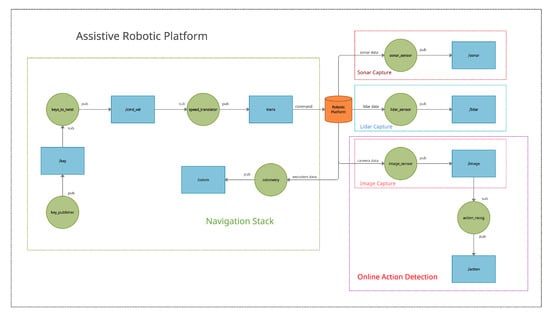 Mobile platforms, the third group, have a dual purpose: service and companionship. Some examples of these mobile platforms can be found in [,,,,]. They mainly focus on elderly people, to enable health monitoring. The approach we present in this work belongs to this third group. In contrast to [,], we do not need any expensive commercial platform to be adapted. We introduce a novel mobile low-cost robotic platform, which has been specifically designed to assist children with ADLs, by embedding an AI based module for online action monitoring.