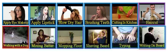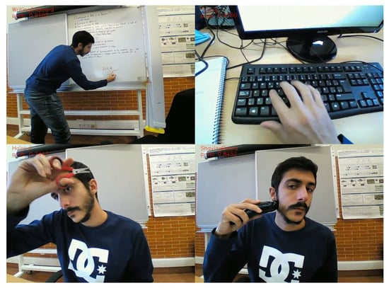 In order to implement the described monitoring, it was necessary to train our AI action recognition model to identify the actions of interest—daily living actions. However, the fact is that there are many databases for action recognition (e.g., [,,,,]), but most of them provide few actions that are valid for the described scenario.
