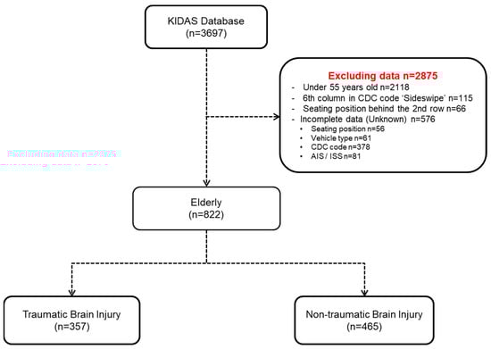 Lee, H.Y.; Youk, H.; Kim, O.H.; Kang, C.Y.; Kong, J.S.; Choo, Y.I.; Choi, D.R.; Lee, H.J.; Kang, D.K.; Lee, K.H. A Predictive Model to Analyze the Factors Affecting the Presence of Traumatic Brain Injury in the Elderly Occupants of Motor Vehicle Crashes Based on Korean In-Depth Accident Study (KIDAS) Database. Int. J. Environ. Res. Public Health 2021, 18, 3975. https://doi.org/10.3390/ijerph18083975