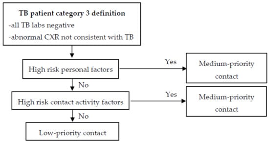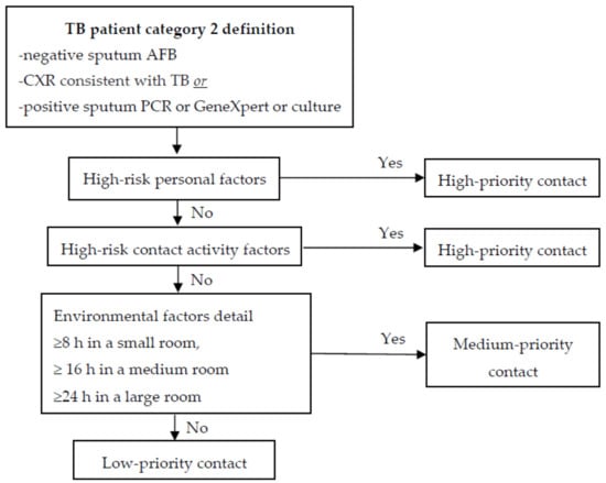 A TB patient will be categorized into one of three levels based on infectivity. When HWs have contact with each TB patient category, the priority of contact is determined step-by-step: personal factors (risk of aTB), contact activity (risk of LTBI), and environmental factors (risk of LTBI). The steps of the contact prioritization process are presented in Figure 1, Figure 2 and Figure 3, according to the category type [10].