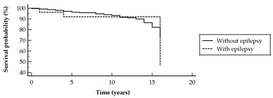 There was no impact of a diagnosis of epilepsy on the survival probability of DM subjects (chi-squared = 0.22, p = 0.6365; hazard ratio (HR) 0.73 [95% CI 0.19–2.73]) (shown in Figure 1), and PM patient survival rate (chi-squared = 0.56, p = 0.4536; HR 0.50 [95% CI 0.08–3.10]) (shown in Figure 2).