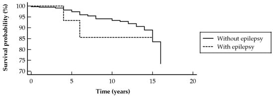 Kaplan–Meier survival curve of dermatomyositis patients with and without epilepsy, showing no significant impact on mortality rate.