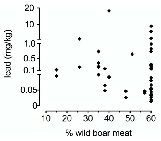 No significant correlation was found between the percentage of wild boar meat in the samples and the lead concentrations (r = −0.18, p = 0.21) (Figure 1).