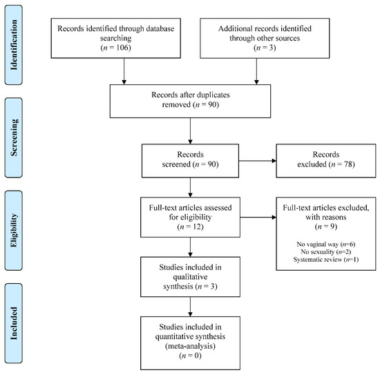 Figure 1 is a flowchart of the stages of the systematic review. The search found 106 studies, 49 and 57, respectively, from MEDLINE and Embase. A further three were added from the Cochrane Library trials register [1,22,23]. After eliminating duplicates, 90 studies were evaluated by title and abstract, and of these, 12 subsequently underwent full-text analysis [1,16,22,23,24,25,26,27,28,29,30,31]. In this analysis, nine articles were eliminated for the following reasons: vaginal procedure not included: (n = 6) [24,25,26,27,28,30], sexuality not analyzed (n = 2) [22,29], or because they were systematic reviews (n = 1) [23]. Hence, three papers were eventually included in our systematic review [1,16,31].