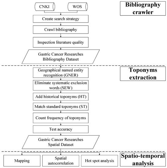 Overall workflow chart of the toponym extraction and spatiotemporal analysis of gastric cancer research hotspots in China.