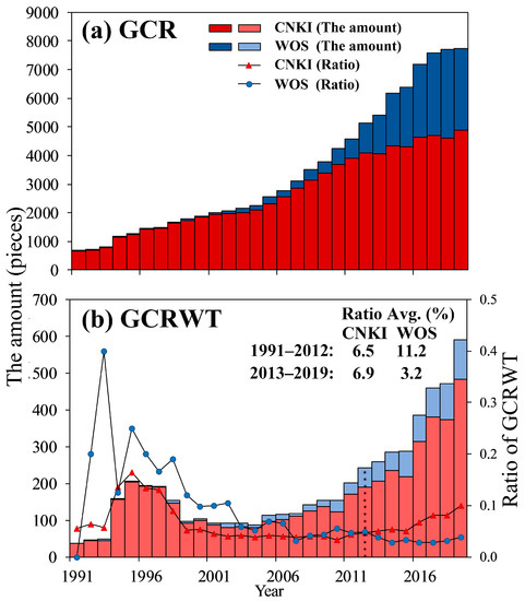 Interannual changes in the amount of gastric cancer research (GCR) and gastric cancer research with toponyms (GCRWT) (1991–2019). (a) The amount of GCR in the CNKI and WOS; (b) the amount of GCRWT and GCRWT ratio in the CNKI and WOS (GCRWT Ratio = GCRWT/GCR × 100%; Ratio Avg. is the average of the GCRWT Ratio by year, and the dotted line marks the dividing line of the GCRWT Ratio).
