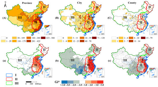 Spatial distribution of gastric cancer research and hotspots at the province, city, and county scales in China from 1991 to 2019. (A), (B), and (C) are the spatial distributions of the number of gastric cancer studies at the province, city, and county scales, respectively. (a–c) are the spatial distributions of gastric cancer research hotspots at the province, city, and county scales, respectively. (I: Eastern region; II: Central region; III: Western region [33]).
