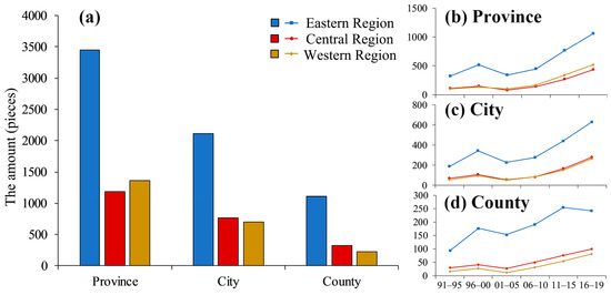 The number of gastric cancer studies in the eastern, central, and western regions at the province, city, and county scales and their changes in the different time periods. (a) The number of gastric cancer studies at the province, city, and county scales in the three regions; (b–d) the changes in the gastric cancer studies at the province, city, and county scales at different time periods in the three regions.