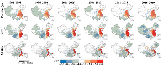 In this study, six time periods were mapped, and the autocorrelation and spatiotemporal changes in the gastric cancer research hotspots from 1991 to 2019 were analyzed. The studies at the province, city, and county scales showed significant spatial agglomeration in each time period (Table 4). At the province scale, the Moran’s I increased from 1991 (0.130) to 2015 (0.220) and then decreased in 2016–2019 (0.117). At the city scale, it stably increased from 1991 (0.064) to 2019 (0.115). At the county scale, it began with a large value (0.048) in 1991–1995, stably increased from 1996 (0.017) to 2015 (0.052) and remained stable in 2016–2019 (0.050).