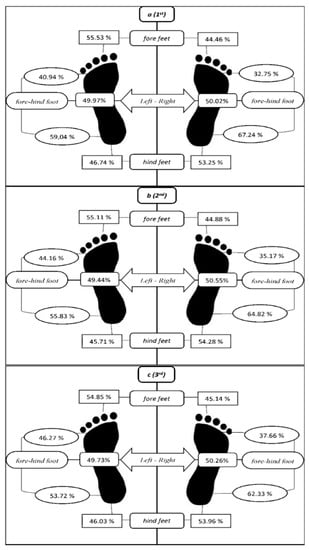 In the evaluation of the GRF values via paired t-test, there were significant differences in all matched-pairs (0.001 < p < 0.0024, 0.024 < ES < 0.34) except “leg total (right vs. left)” in the first section. In the second section, there were significant differences in all matched-pairs (0.001 < p <0.005, 0.034 < ES < 1.4) except “total (right vs. left)” and “left foot (fore vs. hind)”. In the third section, there were significant differences in all matched-pairs (0.002 < p < 0.033, 0.034 < ES < 1.15) except “total (right vs. left)” and “left foot (fore vs. hind)” (Table 2). Distributions of the GRFs are shown in Figure 1 for each section.