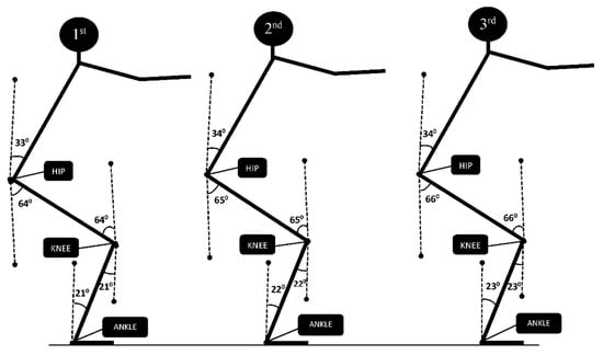 The ROM of the hip, knee and ankle were in the first section; 97° (33° + 64°), 85° (21° + 64°) and 21°, in the second section, they were 99° (34° + 65°), 87° (22° + 65°) and 22° and in the third section, they were 100° (34° + 66°), 89° (23° + 66°) and 23° (Figure 2).