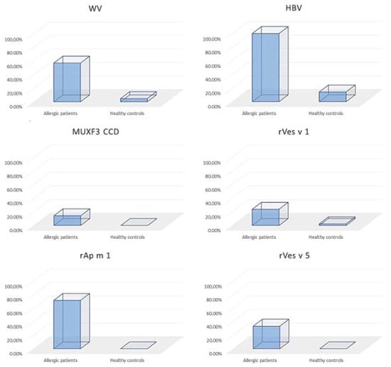 Percentage distribution of positive values of specific IgE (sIgE) within tested groups. sIgE was determined to WV wasp venom, HBV honeybee venom, MUXF3 CCD cross-reactive carbohydrate determinant estimated to MUXF3 from bromelain, rVes v 1 recombinant phospholipase A1 (Vespula spp.), rAp m 1 recombinant phospholipase A2 (Apis mellifera), rVes v 5 recombinant antigen 5 (Vespula spp.).
