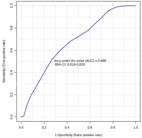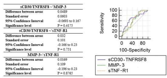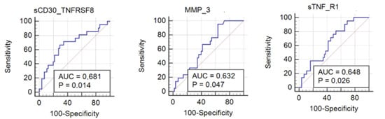 In the last step, combinations of three inflammation factors (sTNF-R1, MMP-3, and sCD30/TNFRSF8), earlier selected as significant, were evaluated using multivariate receiver operating characteristic analysis (Figure 6). Model-based on three markers demonstrated slightly higher discriminatory ability (AUC 0.69) than a single marker, sCD30/TNFRSF8 (AUC 0.68). Elimination of any variable or the addition of further variables into the model causes a decrease of the area under the curve.