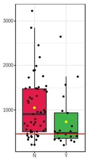 Box-plot of the concentrations of sCD30/TNFRSF8 53 in both groups. A horizontal line is in red, indicating the optimal cut-off. N—control group; Y—allergy group.