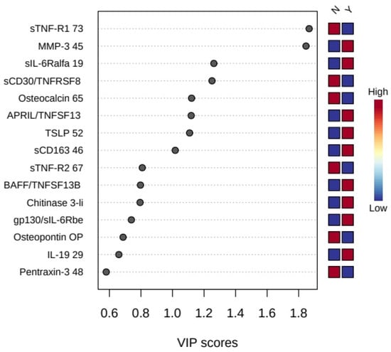 The data were also analyzed using multivariate statistical analysis. Partial-Least Squares Discriminant Analysis was performed to determine the differentiation ability of inflammation factors profiles and to distinguish the studied groups. The PLS-DA analysis pointed variables, which have the greatest importance in the sample grouping. It has been confirmed that inflammation factors earlier selected in univariate statistics have the best efficacy in discriminating between groups (VIP score > 1.2). Figure 5 shows the variables listed according to their contribution in sample classification. The most differentiating markers were: sTNF-R1, MMP-3, sCD30/TNFRSF8, and sIL-6Ralfa. VIP scores for sTNF-R1 and MMP-3 markers reached a value above 1.8.