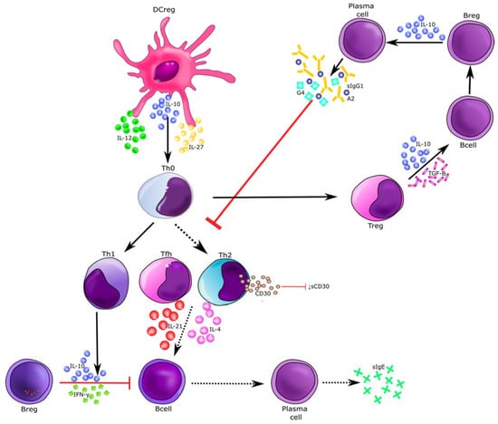 Immunotherapy-induced molecular changes of Hymenoptera venom allergy reaction. Red arrows indicate blocking activity induced during venom allergen immunotherapy. Hymenoptera venom stimulates dendritic cells and induces Treg, B reg, and other B cells to produce allergen specific IgG1, IgG4, and IgA type bloking antibodies that inhibit the activity of Th2 cells. As a result a shift from Th2 to Th1 type immune deviation occurs. Decrease of Th2 cells level is associated with lowering the expression of CD30 molecules on their surface and consequently leads to reduction of sCD30 in serum []. sCD30—soluble CD30; Treg—T regulatory cells; B reg—B regulatory cells; Tfh—T follicular hepler cells; DC reg—regulatory dendritic cells; Th1—T helper 1 cells; Th2—T helper 2 cells.