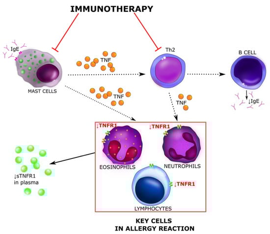 The molecular mechanism determining sTNFR-1 serum levels. Red arrows indicate blocking activity induced during venom allergen immunotherapy. Mast cells play an important role both in IgE-dependent and IgE-independent allergy responses. They have the ability to synthesize and secrete many different cytokines, including IL-3, IL-4, IL-5, and TNF alpha which can extend the allergic reaction. The cytokines and other mediators secreted by mast cells cause an influx of T cells, monocytes and eosinophils into the site of the sting, causing a late-phase reaction (after 6–12 h) dominated by a cellular infiltrate. TNF alpha is a cytokine that plays an important role in allergic reaction. In allergic diseases, elevated levels of TNF reportedly trigger an inflammatory cascade through TNFR1. Immunotherapy causes a decrease in the level and activity of mast cells and Th2 lymphocytes. Both of them secrete TNF, which the major receptor is TNFR1, and is found on most cells of human body. The decrease in TNF production causes a reduction of TNFR1 receptors on the cell membrane and lowers sTNFR1concentration in serum [,]. sTNFR-1—soluble tumor necrosis factor receptor 1; Th2—T helper 2 cells.