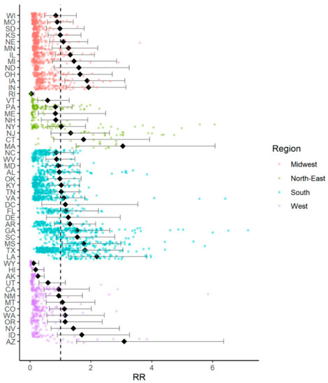 Figure 1 and Table S4 illustrate the RR for COVID-19 at the state level. Seven of the 51 territories (50 states and D.C.) had a risk higher than average, namely, IA (RR = 1.87, 95% credible interval (CI): 1.13–3.11), IN (RR = 1.92, CI: 1.18–3.15), MA (RR = 3.05, CI: 1.51–6.08), LA (RR = 2.19, CI: 1.27–3.83), MS (RR = 1.76, CI: 1.05–2.97), TX (RR = 1.80, CI: 1.07–3.04), and AZ (RR = 3.08, CI: 1.52–6.34). Conversely, only four of the 50 states (RI, AK, HI, and WY) had an RR lower than the national average.