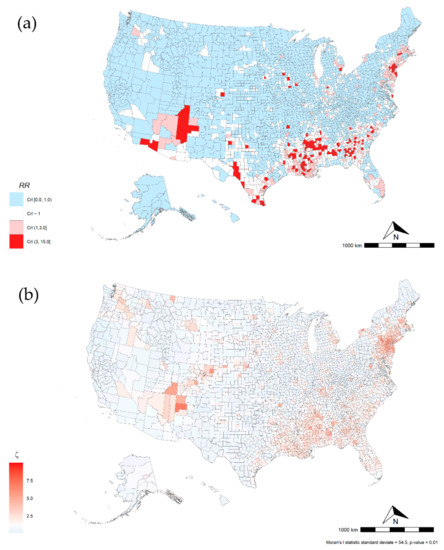 U.S. Relative Risk for COVID-19 mortality by county, mean = 0.63 (CrI range is 0.00–14.8) (a). U.S. COVID-19-related relative risk (RR) of death and (b) COVID-19 spatial effect.