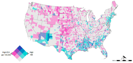 Intensive care units (ICU) bed availability per 100,000 (ICU information was not available in AK and HI). Dark purple indicates counties with high ICU availability and low mortality risk, whereas areas in darker green-blue indicate counties with high mortality risk but low ICU availability. Both variables were classified with a tertile scheme as follows: COVID-19-related RR (0–1 lower risk, 1–3 medium risk, and 3 > high risk) and ICU beds per 100,000 (<28.4 low availability, 28.4–100 medium availability, and >100 high availability).