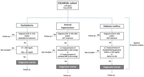 The window of exposure is defined as the six months starting from study inclusion; the exposure variable is diagnostic inertia. For hypertension, this will be defined according to clinical practice guidelines as high registered levels of systolic (≥140 mmHg) or diastolic (≥90 mmHg) blood pressure on two separate occasions during the window of exposure, but without a diagnosis of arterial hypertension, based on the corresponding code from the International Classification of Diseases, 9th edition (ICD-9: 401–405). Diagnostic inertia of dyslipidemia is defined as no diagnosis (ICD-9: 272) despite blood tests showing abnormally high lipids at any time point in the window of exposure, established by clinical guidelines as levels of total cholesterol of more than 200 mg/dL or levels of high-density lipoprotein (HDL) cholesterol of less than 45 mg/dL. Finally, diagnostic inertia of diabetes is defined as the lack of a diagnosis of diabetes mellitus (ICD-9: 250) in the presence of at least two measurements of elevated fasting glycemia (≥126 mg/dL) or glycated hemoglobin (HbA1c ≥ 6.5%) on two separate occasions during the window of exposure.