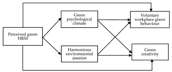 In addition to the cognitive mediating process of green psychological climates, employees’ perceived green HRM may influence employees’ green behaviors via an affective route. Affect refers to a broad range of feelings that individuals experience including emotions (intense feelings that are directed at green HRM), moods (feelings that tend to be less intense, longer-lived, and more diffuse feelings), and attitudes (positive or negative orientations toward green HRM) [45,56]. Based on the affective concepts related to this theory, the current study investigates the other path, i.e., harmonious environmental passion, through which green HRM influences employees’ proactive green behaviors. According to Robertson and Barling [57], harmonious environmental passion refers to a positive emotion that results in an individual wanting to engage in pro-environmental behaviors. Gilal et al. [27] found that green HRM enhances environmental performance via employees’ environmental passion. When employees view the organization that they work for adopting a set of green HRM practices that penetrate various human resource attributions (e.g., rewards for environmentally friendly behaviors, high levels of empowerment given to employees to engage in pro-environmental initiatives and strong employee involvement in green decision-making, take initiative on environmental issues) [58], they are more likely to exhibit a high degree of passion towards these environmentally friendly activities. In this case, green HRM perceived by employees will evoke their harmonious passion for environmental sustainability.