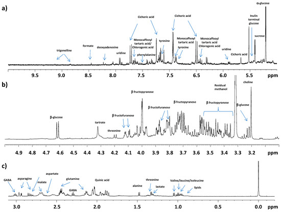 1H-NMR (Nuclear Magnetic Resonance Spectroscopy) typical spectrum of a C. inthybus aqueous extract samples. Expanded areas in of (a) (−0.5 to 3 ppm), aliphatic region; (b) (3–5 ppm) sugars region; (c) (5–10 ppm) aromatic region. The peaks of relevant metabolites are indicated.