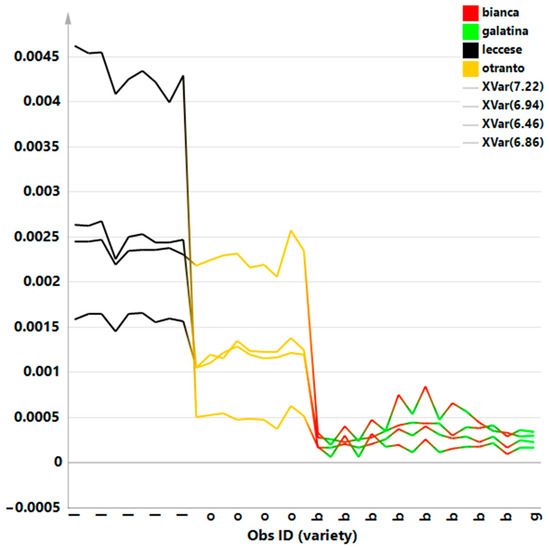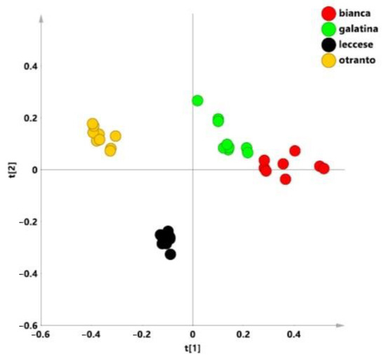 In order to examine an overview of the whole bucket reduced NMR data set, a preliminary unsupervised PCA was applied. In this model, three components gave excellent descriptive parameters: R2X = 0.878 and Q2 = 0.833. The t1/t2 scores plot for the model (Figure 3), revealed a clear clustering of the samples according to the studied varieties. As observable from visual inspection of the scores plot, “Galatina” and “Bianca” varieties were placed as a macro group at positive values of t1 and t2 component. On the other hand, at negative values of t1 component, “Otranto” and “Leccese” samples were observed, clearly separated, and at negative and positive values respectively along the t2 component. The distance to the model of X (DMODX) for the model (Figure S2) indicated that no observations resulted outside the critical distance; therefore, all the samples were included in the model and used for further analysis.