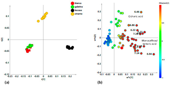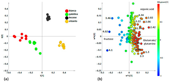 (a) OPLS-DA t[1]/to [1] scores plot for “Otranto”and “Leccese” local varieties (1 + 1 + 0, R2X = 0.948, R2Y = 0.996, Q2 = 0.995) focusing aromatic spectral region). (b) S. line plot for the model, colored according to the correlation scaled coefficient (* p(corr) ≥ |0.5|). The colour bar associated to the plot indicates the correlation of the metabolites in segregating among classes.