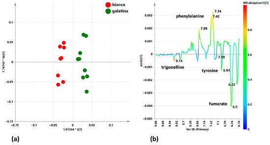 In the “Galatina” vs. “Bianca” comparison, the resulting model was characterized by a clear separation between the two considered classes and described by good descriptive and predictive parameters (1 + 1 + 0, R2X = 0.671, R2Y = 0.941, Q2 = 0.842) (Figure 7a). The S line plot for the model indicated the presence of higher relative content of phenylalanine for “Galatina” varieties (Figure 7b). On the contrary, a higher relative content of tyrosine, fumarate and trigonelline, an important alkaloid already described for its therapeutic properties [81] was observed in the Bianca class.