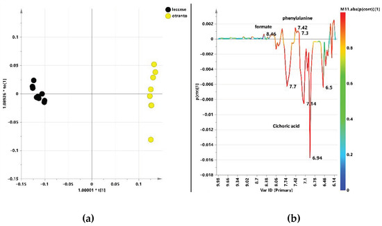 Another pair wise OPLS-DA analysis was then performed by comparing the metabolic profiles of “Leccese” and “Otranto” in the aromatic region. Moreover, in this case, the resulting OPLS-DA model (Figure 8a) showed a clear separation between the two considered classes with excellent descriptive and predictive parameters (1 + 1 + 0; R2X = 0.948, R2Y = 0.996; Q2 = 0.995). The S line plot for the model indicated the presence of higher relative content of aromatic amino acid phenylalanine and formate for “Otranto” varieties (Figure 8b). On the contrary, a strong higher content of cichoric acid was discriminating for “Leccese” varieties. Moreover, cichoric acid (6.94 ppm, 7.7 ppm, and 6.5 ppm) could be considered as a reliable marker for the considered class with high pcorr values as indicated by the red color in the line plot.