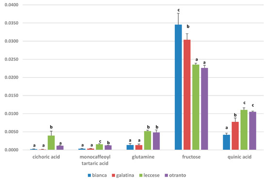 Discriminant metabolites multiple comparison graphical summary for “Bianca”, “Galatina”, “Leccese”, and “Otranto” chicory varieties. The bar plots show the original values (mean +/− standard deviation of integrals corresponding to specific Nuclear Magnetic Resonance (NMR) peak related buckets for each group). Values with different letters indicate significant differences of metabolite level. (Multiple Comparisons of Means test Tukey’s honestly significant difference (HSD) post hoc test).