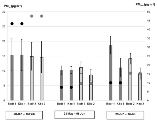 Mean PM2.5 concentrations measured in the three monitoring campaigns (indicated in the bottom insets). Histograms (left scale): indoor PM2.5 values measured in each room, kitchen and bedroom; points (right scale): outdoor PM2.5 values. Error bars represent one standard deviation of the mean. Dark grey histograms and black points represent flat 1 in rural site, light grey histograms and dark grey points represents flat 2 in urban site.