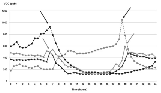 Daily (10 February 2020) evolution of VOCs concentration in each investigated room. Points (dashed lines) represent kitchens and triangles (full lines) bedrooms; black symbols and lines correspond to flat 1; light grey symbols and lines correspond to flat 2. Arrows indicate the occupant activities: black arrows indicate occupants’ cooking activities, while light grey ones indicate go to bed/wake up.