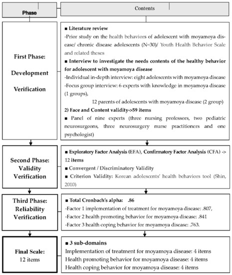 The researchers used the concurrent validity test method to verify the validity of the developed tools. The generalized Korean Adolescents’ Health Behaviors Tool was used at the time of development based on the opinions of moyamoya disease experts who thought it would be the most appropriate tool, as it has been verified for its usefulness in other studies as a measuring tool for adolescents’ health behavior (Chronbach’s Alpha > 0.85). In order to test the concurrent validity of this tool, the correlation with the Korean Adolescents’ Health Behaviors Tool [25] was a total of 72 items, and 14 factors of health behavior. Each questionnaire used a 4-point Likert scale.
