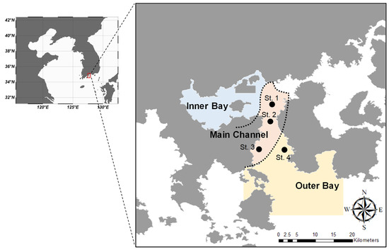 Map illustrating sampling sites in Gwangyang Bay. The boundaries in the bay are as defined by Kim et al. [23] 2019, based on physical and chemical properties.