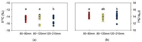δ13C values in P. argentata ranged from −15.6‰ to −13.7‰ in the 60–80 mm TL group, from −16.6‰ to −13.5‰ in the 80–120 mm TL group, and from −16.6‰ to −13.6‰ in the 120–210 mm TL cohort (Figure 2a). δ13C values in the 60–80 mm TL and 80–120 mm TL groups were not statistically different, whereas those of the 120–210 mm TL group were significantly different compared to the other groups (p < 0.05). δ15N values in P. argentata ranged from 11.8‰ to 15.5‰, with no statistical differences among size-fractionated groups (Figure 2b). However, the range of δ15N values was widest in 120–210 mm TL fish (11.8‰ to 15.5‰) and narrowest in the 60–80 mm TL group (13.4‰ to 15.2‰).