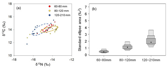 The P. argentata group comprising 80–120 mm was positioned relatively higher in terms of δ13C values in δ-space, whereas the 120–210 mm TL group showed greater depleted of their carbon isotopes (Figure 3a). The distinct δ-space in the 120–210 mm TL cohort resulted in little overlap with the 60–80 mm TL group (13.6%), while the overlapping δ-space between the 60–80 mm TL and 80–120 mm groups was 18.6%. SEA, which indicates niche width, was the smallest in the 60–80 mm TL group (0.4 ‰2), and increased with their TL (1.1 ‰2 for 80–120 mm TL, and 2.0 ‰2 for the 120–210 mm TL specimens, respectively), indicating expansion of niche width in this species accompanied by their growth (Figure 3b).
