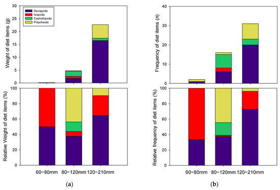 Dietary items in 60–80 mm TL group consisted only of Crustacea, Decapoda, and Isopoda, at similar frequencies (Figure 4b). However, relative weights of diet items were slightly higher in Isopoda (66.7%, Figure 4a). Meanwhile, more variable diet items, including Cephalopoda, Polychaeta, and Crustacea (Decapoda and Isopoda), were found in 80–120 mm TL class. Among the diet items, Polychaeta (43.8%) and Crustacea (37.5%) were present at high frequency, while Cephalopoda (12.5%) and Isopoda (6.25%) were detected at low frequency. Related abundances in biomass of diet items for 80–120 mm TL fish were also high in Polychaeta (44.5%) and Crustacea (37.3%), and low in Cephaloda (16.5%) and Isopoda (1.7%). Crustacea were the major dietary component of 120–210 mm TL group, as Decapoda (64.5%) and (25.8%) were detected at high frequency. Relative biomass of each diet item was also high in Decapoda (72.7%) and Isopoda (23.3%). Although the present study did not find this diet items in all stomach samples, previous studies have mentioned importance of Teleosts as diet items for P. argentata, [25,26]. In particular, Park et al. [26] demonstrated different diet contribution of teleosts for P. argentata between trawl and set net for sampling method. The ppresent study used trawl net for sampling, which may result in the absence of teleost in the stomach of P. argentata.