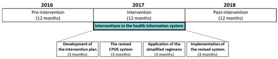 This pre- and post-intervention study evaluated the effect of an initiative toward simplifying prescriber-focused medication, which was mainly facilitated by improving the CPOE system. The overall study lasted for 36 months (January 2016–December 2018), which was divided into three periods: 12-month pre-intervention (January 2016–December 2016), 12-month intervention (January 2017–December 2017), and 12-month post-intervention (January 2018–December 2018) (Figure 1).