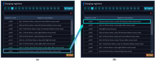 The standardization of candidate regimens such as “30 min after meals” (1261 drugs) and “right after meals” (123 drugs) were unified into a single category: ”after meals.” In addition, default regimens for 65 drugs were revised within the range of the approved package labels provided by the Ministry of Food and Drug Safety in Korea. Table 1 presents the changes in regimens and the names of a few medications as examples. Drugs that had interactions with foods or should be administered in specific time intervals for maintaining an optimal blood concentration were excluded.