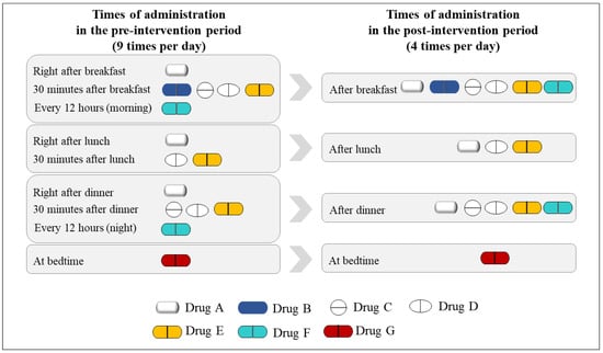 The dosing frequency was calculated using the medication regimens described in each prescription by counting the different administration times separately. For example, if four medications were prescribed as follows: the first medication once a day after a meal, the second medication every 12 h, the third medication three times a day after each meal, and the fourth medication at bedtime, then the total dosing frequency per day would be six (three (after each meal) + two (every 12 h) + one (at bed time)). Figure 4 provides a case example of an improved dosage regimen in the pre- and post-intervention periods. A patient took the medicine nine times per day, as prescribed by the clinician in the pre-intervention period; however, the dosing frequency per day was decreased to four times per day in the post-intervention period. The improved dosage regimens were printed on the drug labels of each discharged medication.