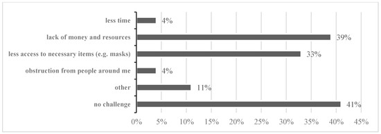 From the findings, a good number of participants (39%) claimed that they had difficulties in taking measures against COVID-19 transmission because they lacked money and resources. Meanwhile, 33% mentioned that they had less access to necessary preventive supplies (Figure 1). For the 16% of people who did not adopt any prevention measures, the reasons varied. Most people (61%) did not take any action because of a lack of resources or access, while 11% thought that they and their family were not at risk, and 12% thought COVID-19 was not a problem.