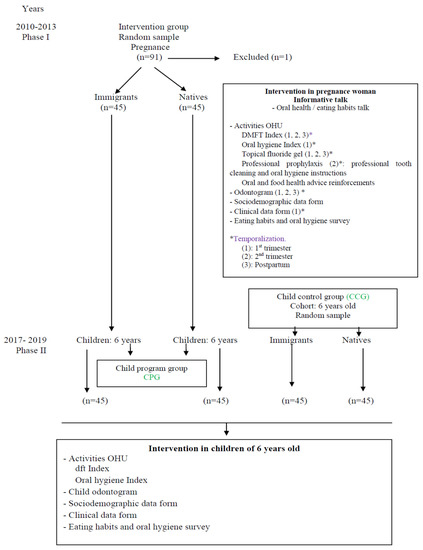 The present prospective case-control study was carried out in two phases following the Strengthening the Reporting of Observational Studies in Epidemiology (STROBE) criteria [27]. Phase I was in instruction of prevention and oral health habits in pregnant patients who attended a Public Health Center. Phase II was the evaluation of the preventive effect on the expression of caries in participants’ children at the age of 6, comparing that with the presence of caries in other 6-year-old children whose mothers did not attend the preventive dental program (PDP).