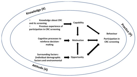 In recent studies, numerous factors associated with poor participation were identified, including old age, low educational level, the recommendation of nurses or physicians, frequency of medical consultation, poor awareness of CRC screening, and inadequate CRC screening promotion [,]. In an older Chinese population, a low participation rate for CRCSP was due to a higher level of cues to action and lower perceived knowledge barriers and severity fears [,,,]. Nevertheless, health promotion was emphasized to raise public awareness and improve the participation rate []. To enhance understanding of KAP towards CRC and its screening, the capability, opportunity, motivation, and behavior (COM-B) model was used to guide this study. The COM-B Model was developed by Michie et al. [] to describe the interactions among capability, opportunity, motivation, and behavior. Capability refers to an individual’s physical and psychological capacity to engage in the activity concerned. It embraces knowledge and skills. Opportunity refers to factors that surround the individual to make specific behavior possible. Motivation refers to cognitive processes including habitual processes, emotional responses, and analytic decision-making to strengthen and direct behavior. The directions of arrows indicate the potential influences of the components on each other. This COM-B model was used to guide the understanding of KAP of people aged 50 to 75 to make CRC screening more comprehensible. Figure 1 shows the COM-B model with KAP components.